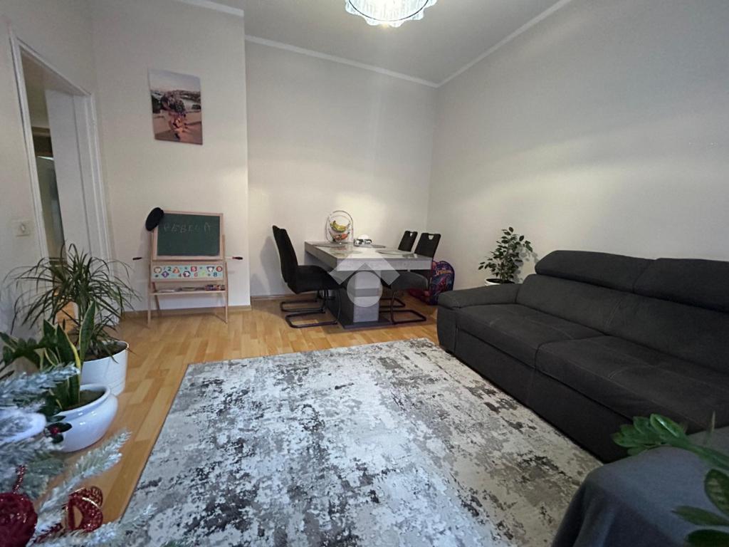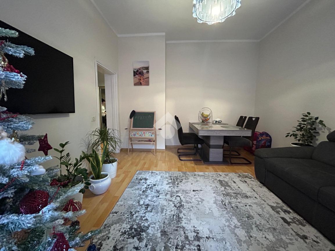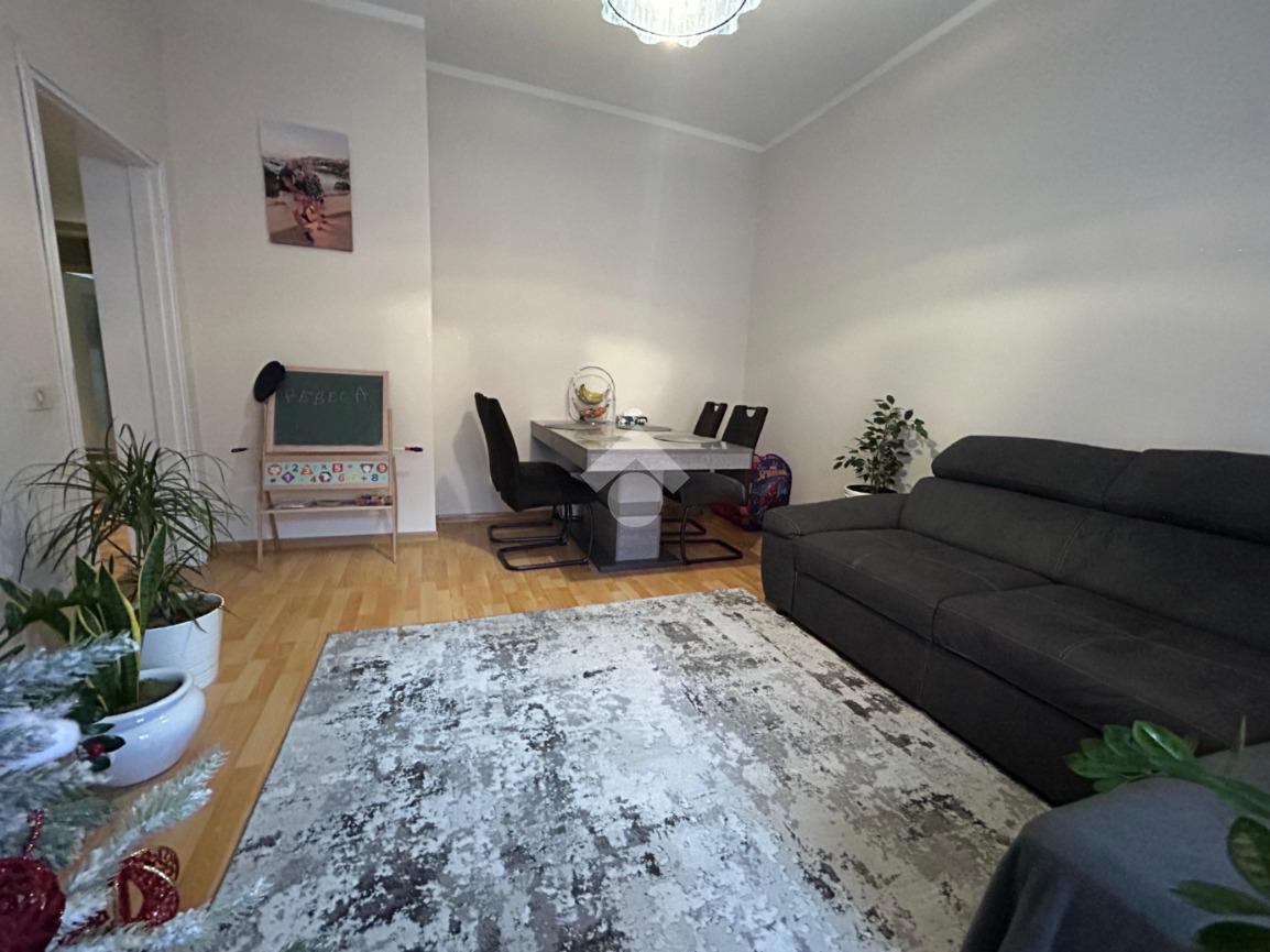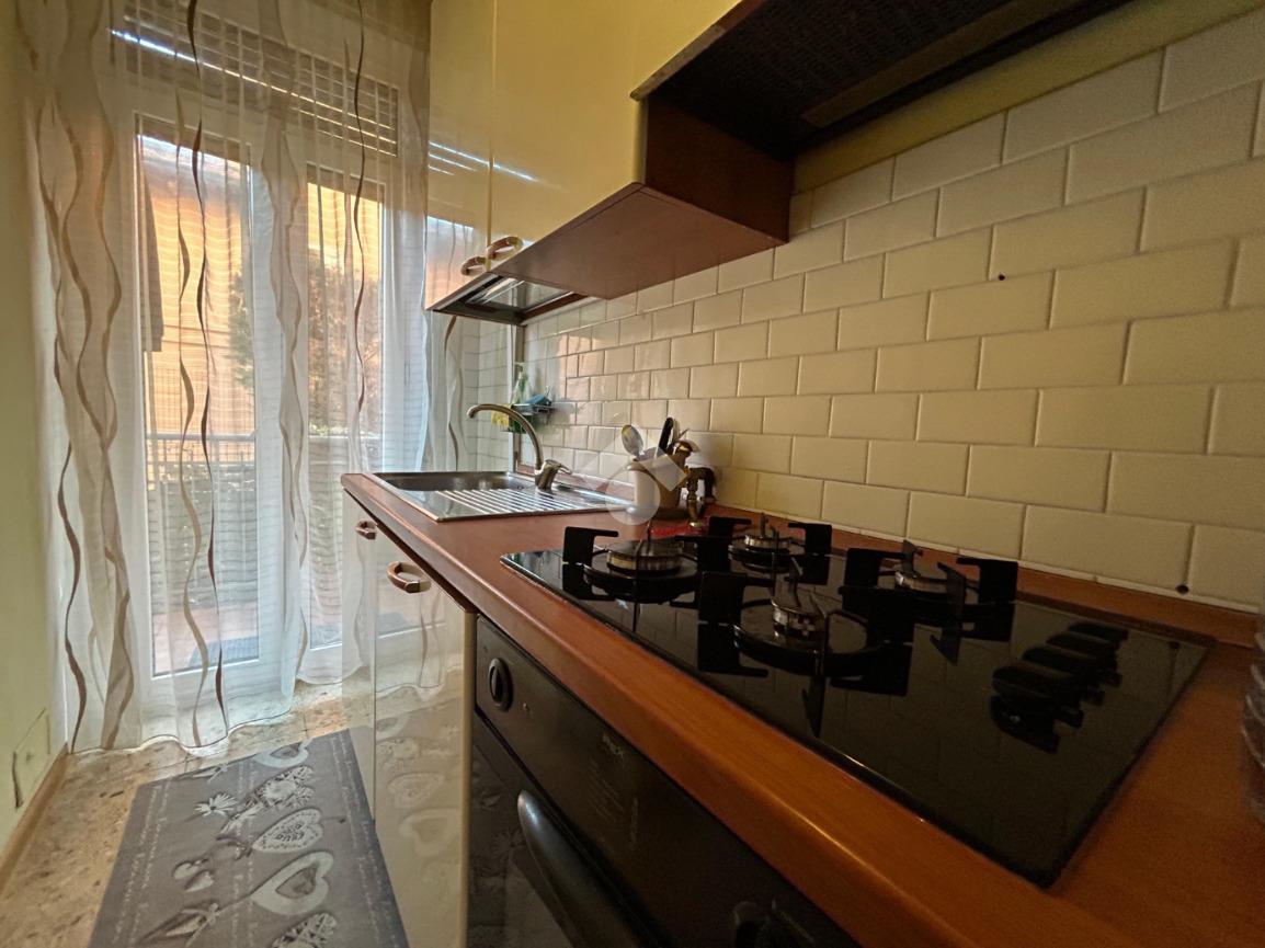 L’appartamento è composto da soggiorno e cucina con angolo cottura (cucina non abitabile), entrambi collegati da un balcone, bagno finestrato e due camere da letto.