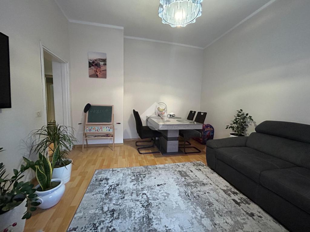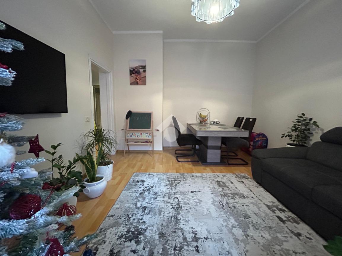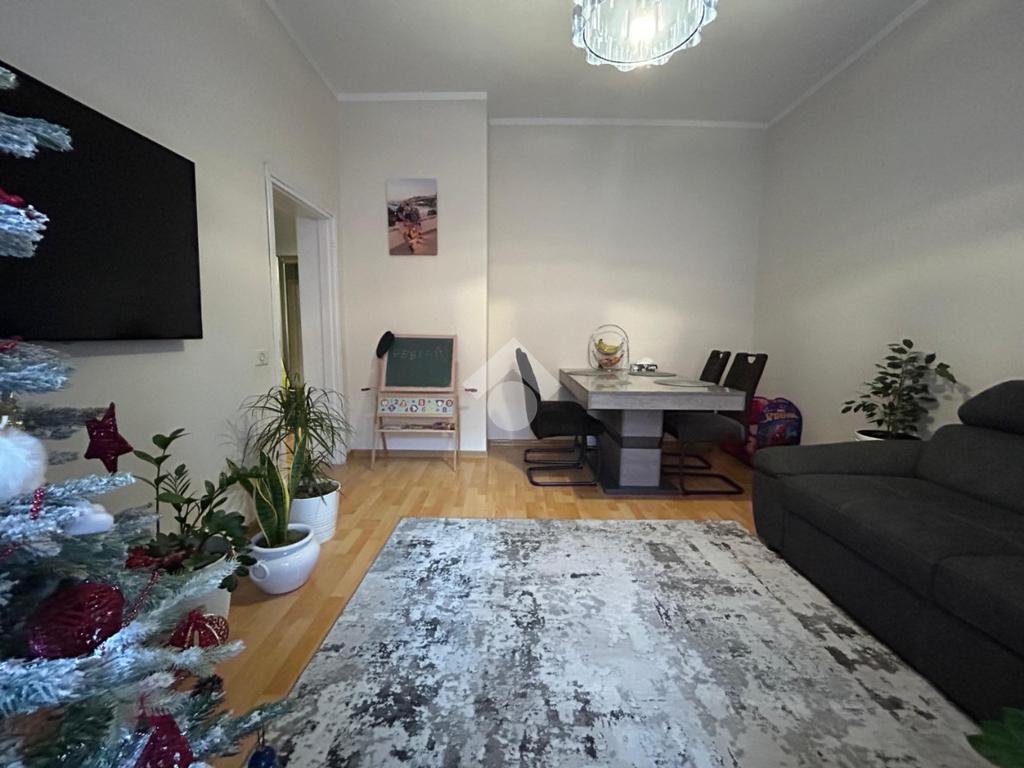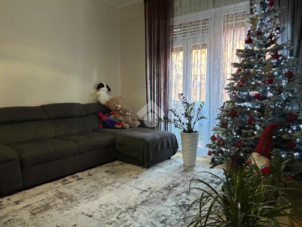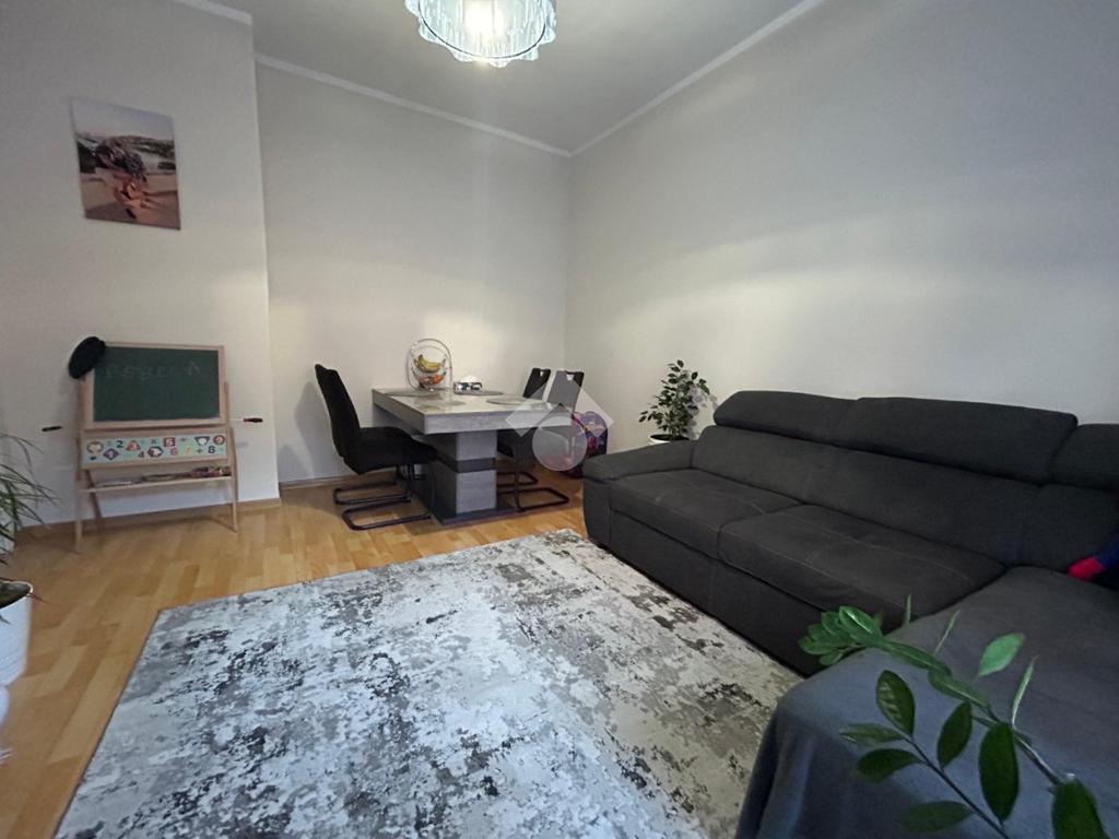 L’appartamento è composto da soggiorno e cucina con angolo cottura (cucina non abitabile), entrambi collegati da un balcone, bagno finestrato e due camere da letto.